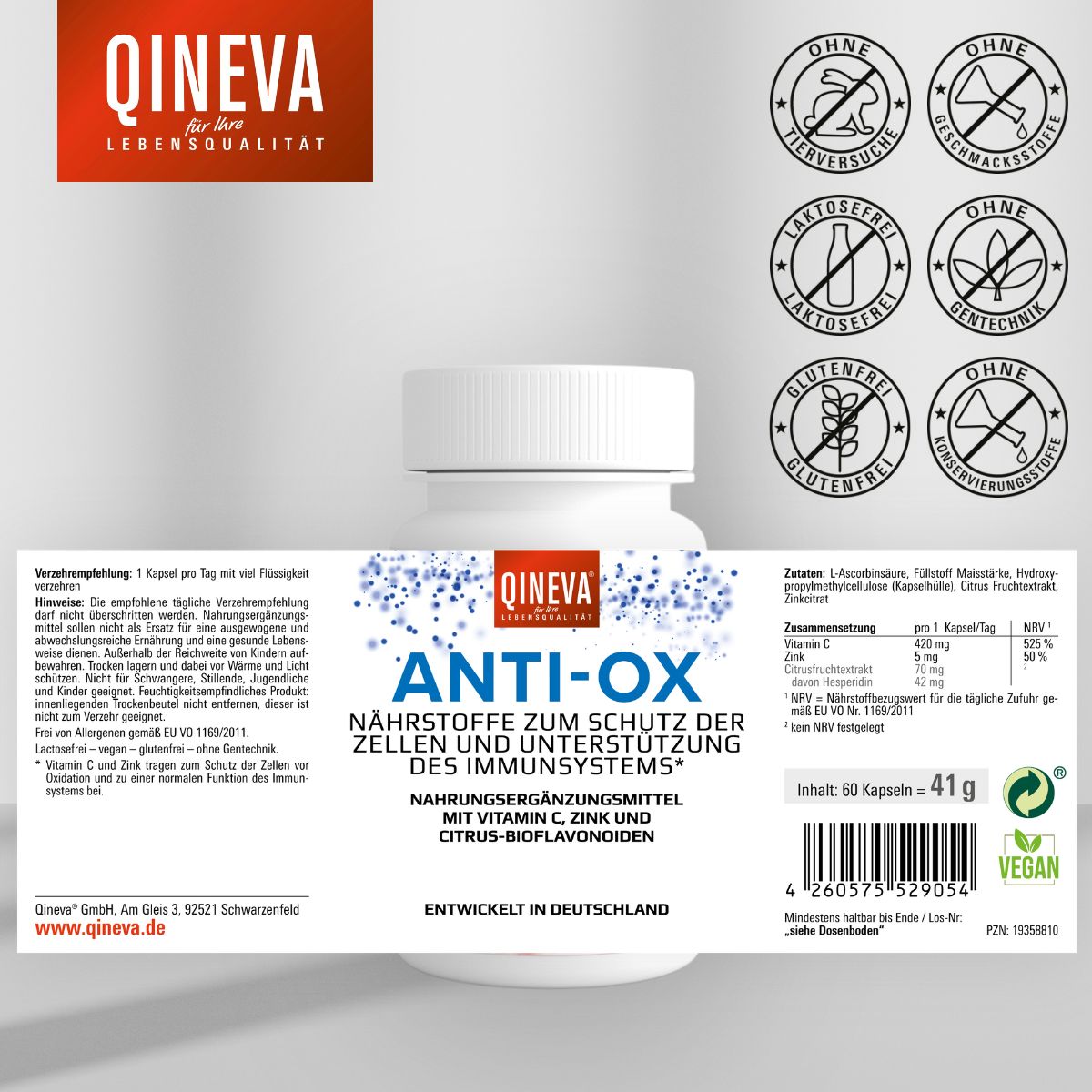 Qineva Anti-OX kombiniert zwei essentielle Mikronährstoffe in einer ausgewogenen Formulierung. Vitamin C und Zink sind wichtige Bausteine für die tägliche Ernährung und unterstützen zentrale Körperfunktionen (1–4).