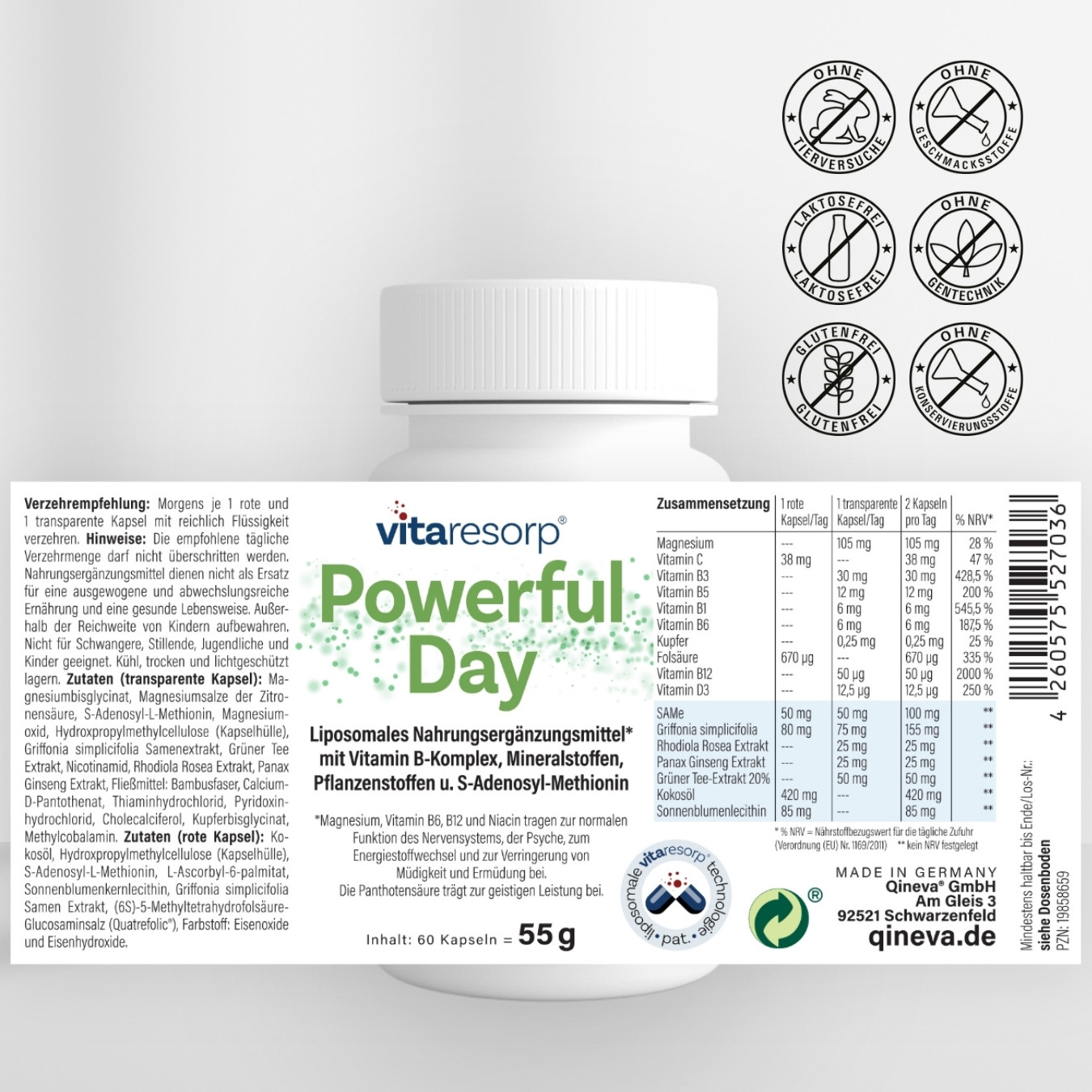 Powerful Day liefert ausgewählte B-Vitamine, Magnesium und Pflanzenextrakte für einen aktiven Start in den Tag. Die enthaltenen Vitamine und Mineralstoffe unterstützen den normalen Energiestoffwechsel1, helfen Müdigkeit und Ermüdung zu verringern2 und fördern die normale Funktion des Nervensystems3. Vitamin B5 trägt zu einer normalen geistigen Leistung4 bei und Magnesium unterstützt die normale Muskelfunktion5.
