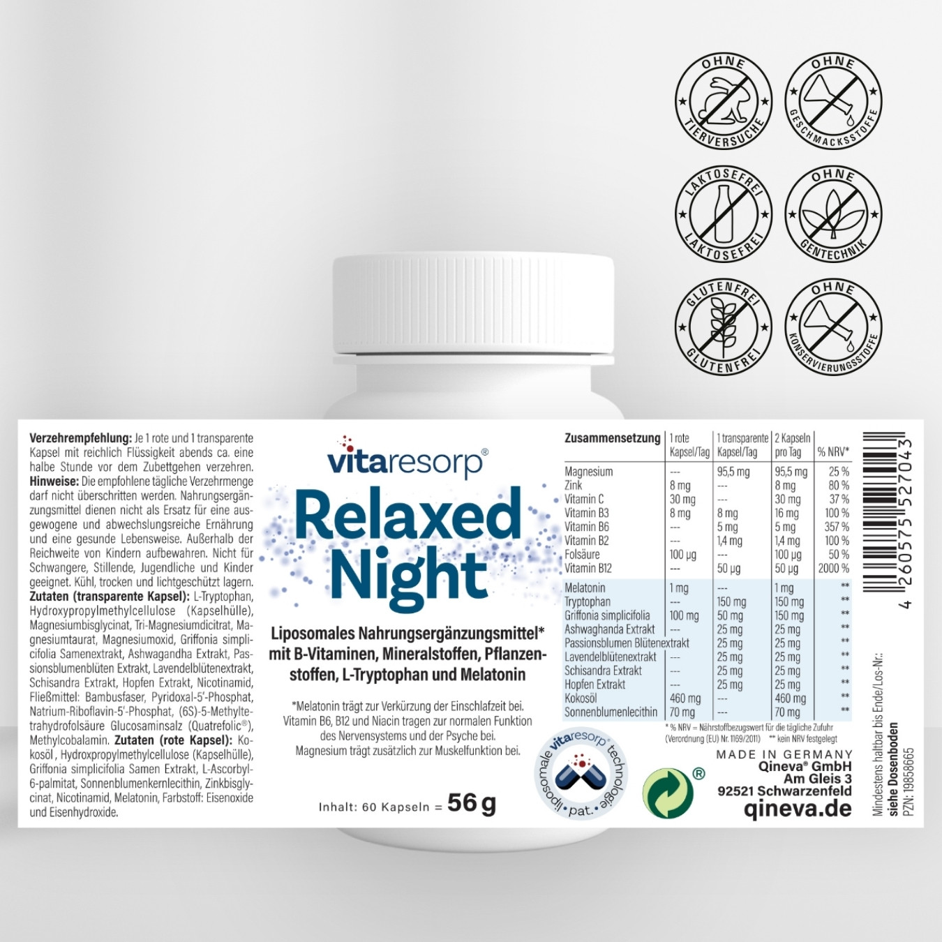 Relaxed Night ist optimal auf deine Abendroutine abgestimmt. Die Formel kombiniert Magnesium, Zink, Vitamin C und einen hochwertigen B-Vitamin-Komplex mit ausgewählten Pflanzenextrakten. Magnesium trägt zur Erhaltung einer normalen Muskelfunktion5 bei, Zink unterstützt die normale Funktion des Immunsystems6 und gemeinsam mit Vitamin C schützt es die Zellen vor oxidativem Stress7. Vitamin B6 trägt zu einem normalen Eiweiß- und Glykogenstoffwechsel8 bei.