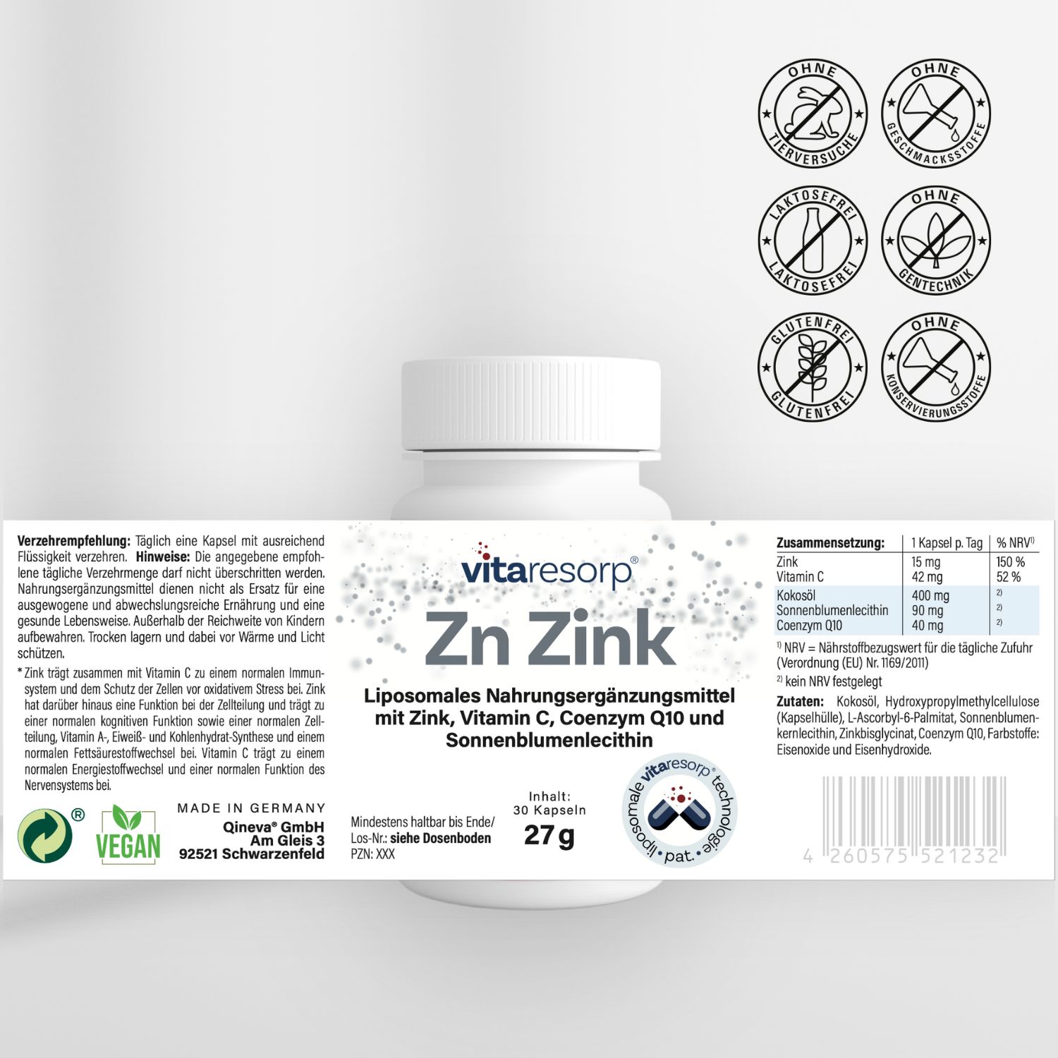 Die liposomale Struktur basiert auf pflanzlichem Lecithin aus Sonnenblumen und dient als technologische Grundlage der Rezeptur. Ergänzt wird die Zusammensetzung durch Kokosöl sowie eine vegane Kapselhülle. Die eingesetzten Inhaltsstoffe sind klar deklariert und orientieren sich an den geltenden lebensmittelrechtlichen Vorgaben.